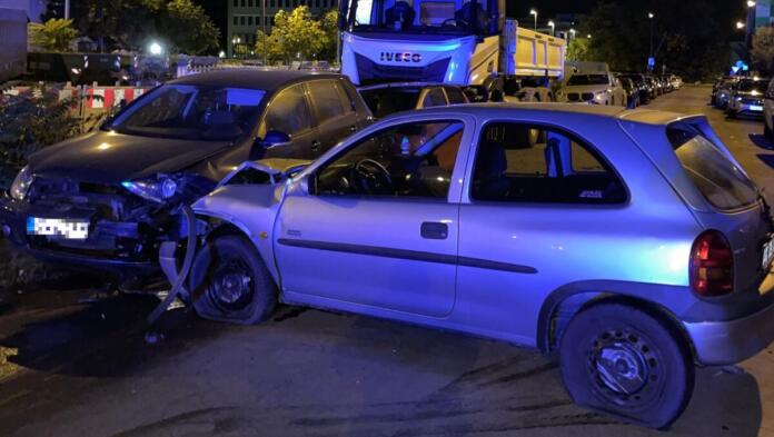 An der Kreuzung zur Strahlenberger Straße verlor der 20-jährige Fahrer aus dem Landkreis Limburg-Weilburg die Kontrolle über seinen Wagen. Der Opel überfuhr einen Bordstein und prallte anschließend gegen drei geparkte Fahrzeuge, die durch die Wucht des Aufpralls ineinandergeschoben wurden. Auch der Streifenwagen verunglückte bei der Nachfahrt und stieß gegen einen Ampelmast.