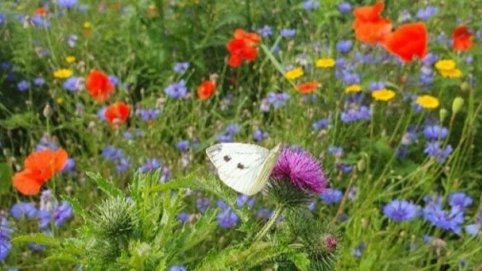 Ein Jahr nach der Flächenbearbeitung kann man die Farbenpracht der Wildkräuterfläche mit einer Vielzahl von Bienen, Schmetterlingen und Libellen bewundern.