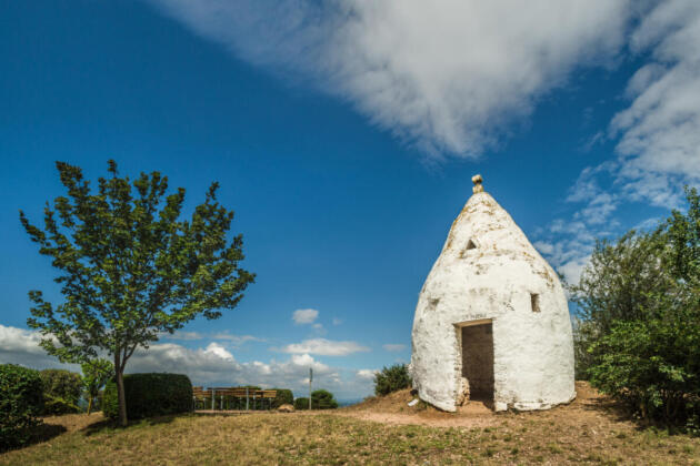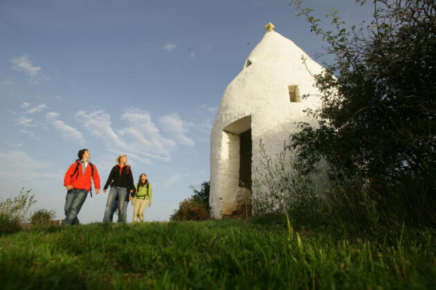 Der Trullo ist ein weißes Rundhaus mit Spitzdach und wurde 1756 im Stil der apulischen Trulli errichtet. Es hält sich das Gerücht, dass italienische Gastarbeiter, die in den Steinbrüchen rund um Flonheim tätig waren, den Trullo gebaut haben. Der Blick von hier oben ist fantastisch.