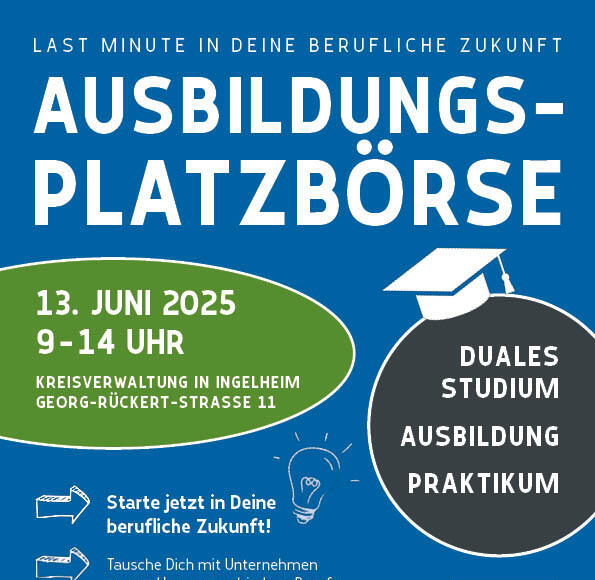 Mit Unternehmen aus der Region ins Gespräch kommen und „Last Minute“ in die berufliche Zukunft starten: Für alle Jugendlichen, die noch auf der Suche nach einem Praktikum, einem Ausbildungs- oder einem dualen Studienplatz sind, bietet die Kreisverwaltung Mainz-Bingen ein passendes Angebot: die Ausbildungsplatzbörse. Zu dieser sind alle Interessierten eingeladen am Freitag, den 13. Juni von 9 bis 14 Uhr im Ingelheimer Kreistagssaal, Georg-Rückert-Straße 11.