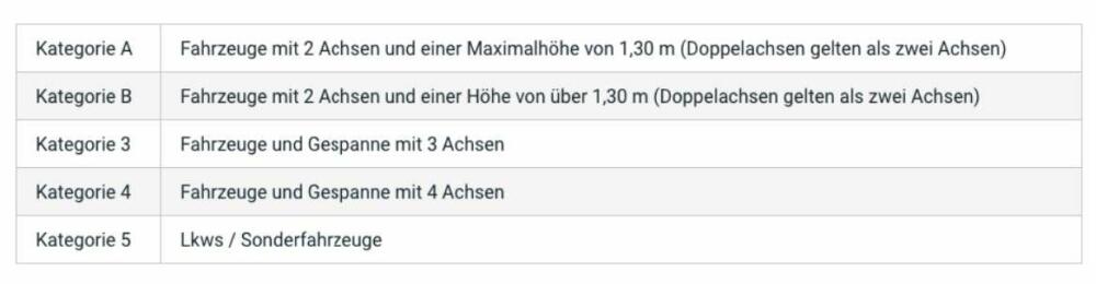 Einer der wichtigsten Aspekte ist ohne Frage die Größe des Fahrzeugs. Wenn Sie nur einen kleinen Pkw fahren, werden sie weit weniger zahlen müssen als bei einem Wohnwagen mit Anhänger. Das liegt daran, dass größere, beziehungsweise schwerere Fahrzeuge die Straßeninfrastruktur stärker belasten. Im Folgenden eine Auflistung vom AUTODOC Club über die Mautkosten verschiedener Fahrzeuggrößen: