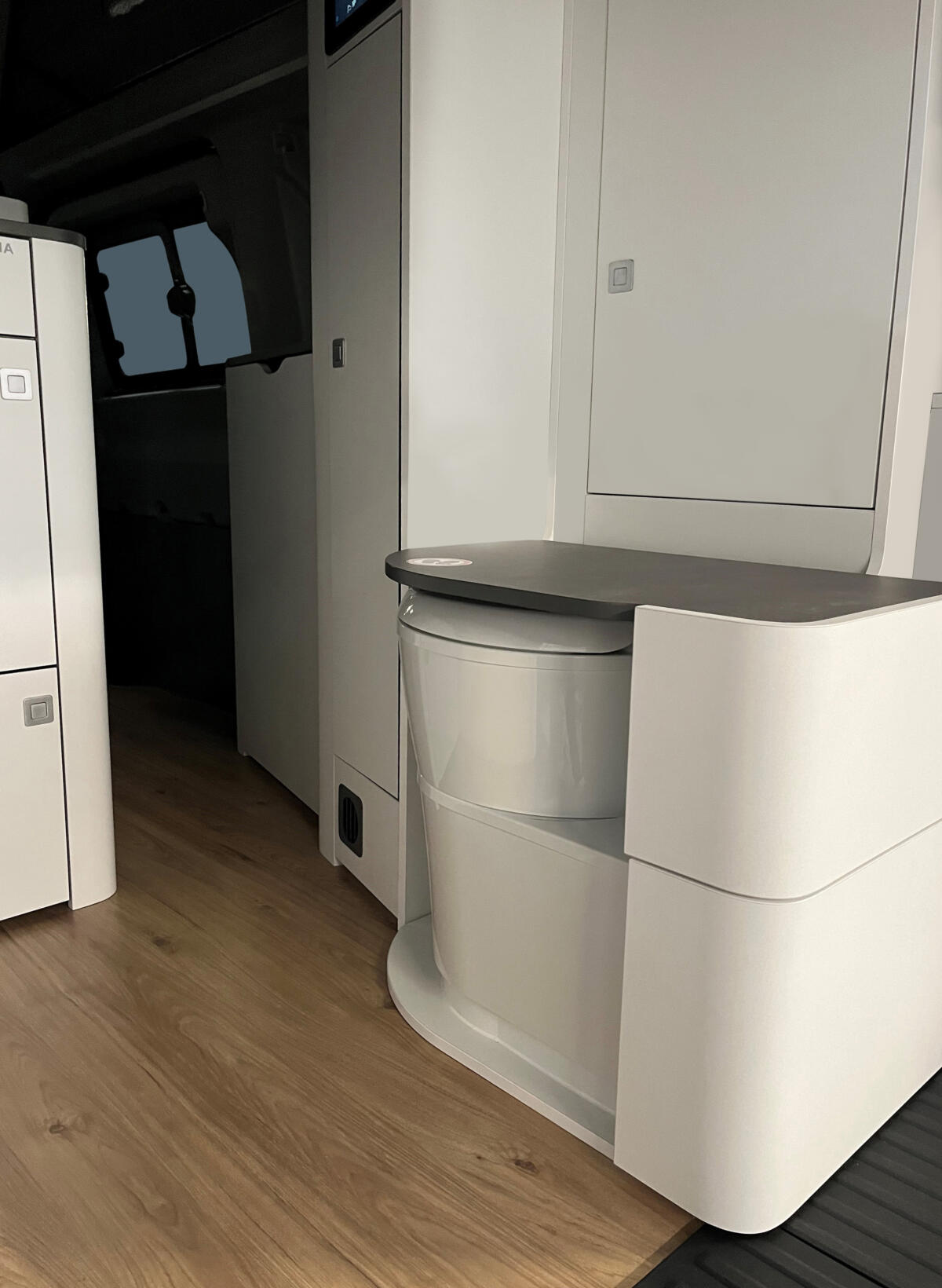 Der Radstand des Ford Nugget wächst bei den L2-Varianten um 40 Zentimeter auf 3,5 Meter. Entsprechend vergrößert sich die Gesamtlänge von 5,05 auf 5,45 Meter, was logischerweise für mehr Platz im Innenraum sorgt. In der Serienausstattung wird dieses zusätzliche Platzangebot für mehr Stauraum in der Küche und einen größeren Kleiderschrank genutzt. Optional bietet Ford Pro nun ─ wie erstmals in Stuttgart zu sehen ─ statt des größeren Kleiderschranks auch L2-Varianten mit festintegrierter Toilette. Dabei handelt es sich um eine auf Chemie basierende Kassettentoilette.