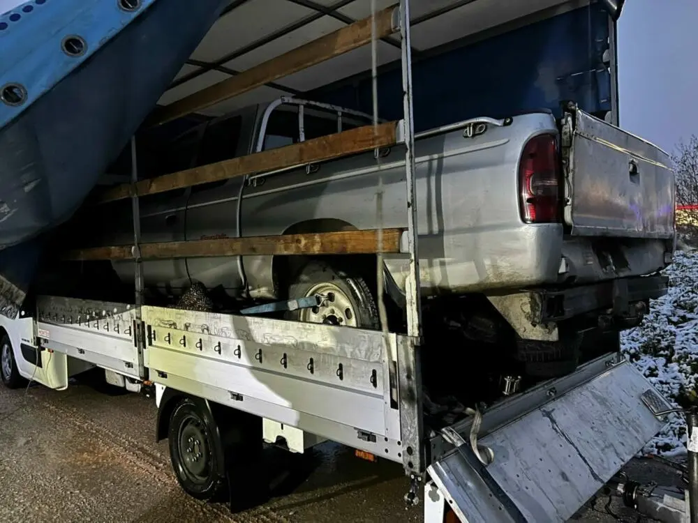 Zunächst rückte der Kleintransporter mit Anhänger in den Fokus des Kontrolltrupps für gewerblichen Güter- und Personenverkehr. Die Beamten bemerkten, dass unter der Plane des Kleintransporters scheinbar das Heck eines Pickups hervorschien. Dies weckte ihre Aufmerksamkeit, da solche Fahrzeuge auf dieser Art von Transportern üblicherweise schwer oder gar nicht ausreichend gesichert werden können.