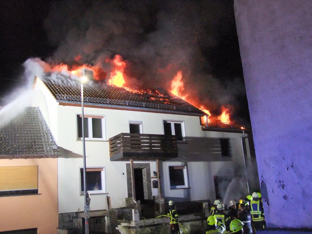 Die Integrierte Leitstelle Bad Kreuznach alarmierte nach dem höchsten Alarmstichwort „Brand 3“ die Feuerwehren aus Spabrücken-Hergenfeld, Wallhausen, Bockenau, Stromberg sowie die Wehrleitung und die Führungsunterstützungseinheiten. Ein Rettungswagen und die Polizei machten sich ebenfalls auf den Weg in die Soonwaldgemeinde. Beim Eintreffen der Spabrücker Einsatzkräfte schlugen bereits meterhohe Flammen aus dem Dachstuhl, aus einer Garage waren eine starke Rauchentwicklung und Feuerschein erkennbar.