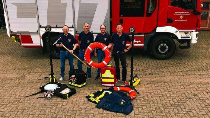 Eine beachtliche Summe: Die Freunde der Feuerwehr Rüdesheim haben über 20.000 Euro in die Ausrüstung der Rüdesheimer Stützpunktwehr investiert.    Anlässlich der Aktivitäten des Fördervereins bei der Rüdesheimer Kirmes übergaben die beiden Vorsitzenden Michael Ginz und Oliver Kien Bekleidung und Material an das Team um die Wehrführer Martin Barth und Rouven Ginz.