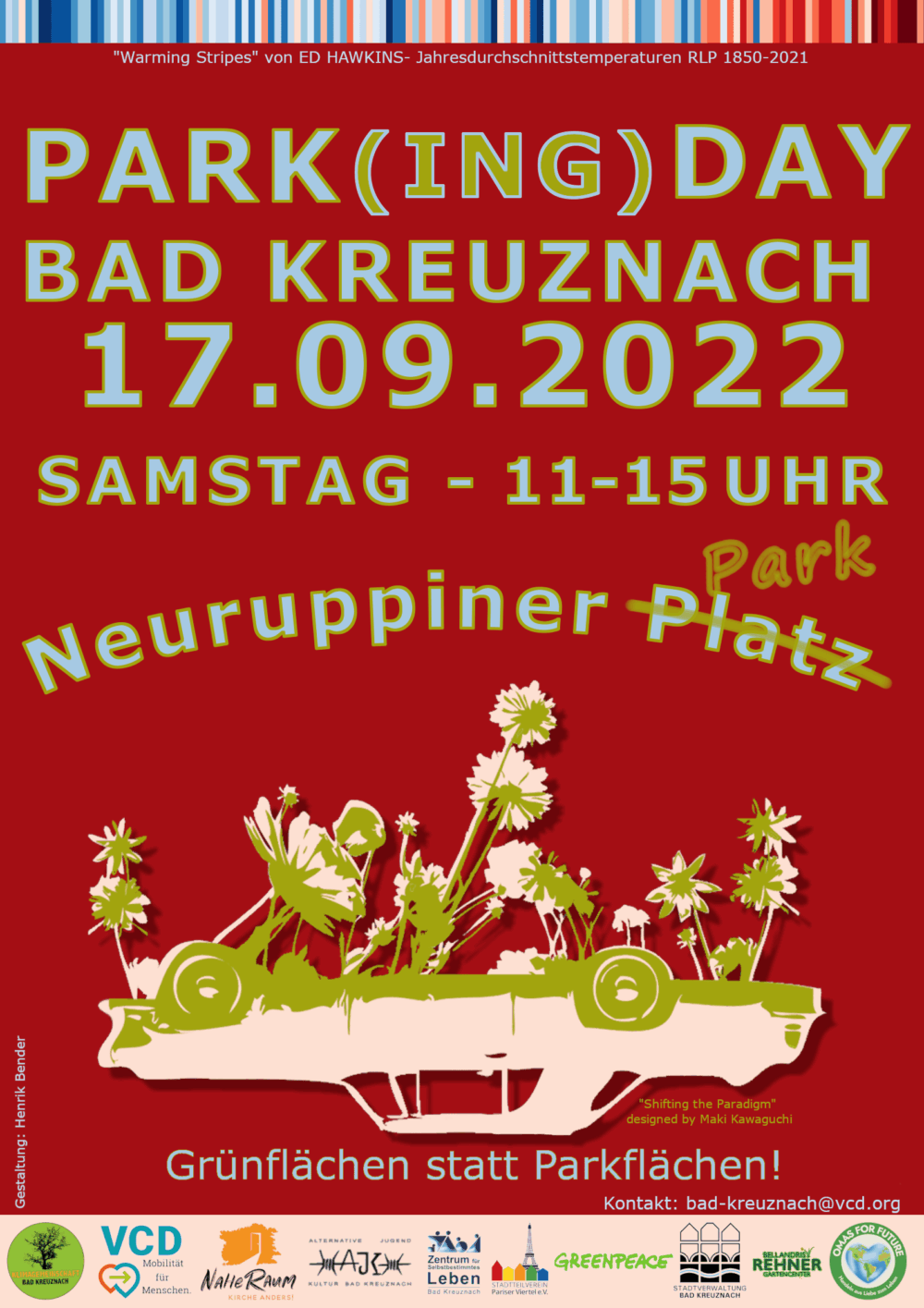Am Samstag, 17. September, 11 bis 15 Uhr, findet unter der Beteiligung der Stadtverwaltung Bad Kreuznach auf dem Neuruppiner Platz zum fünften Mal der Park(ing) Day statt. Jedes Jahr werden an diesem Aktionstag im Rahmen der Europäischen Mobilitätswoche vom 16. bis 22. September Parkplätze in der Innenstadt für einen Tag phantasievoll umgestaltet. Schirmherr der Aktion in Deutschland ist das Umweltbundesamt (UBA).