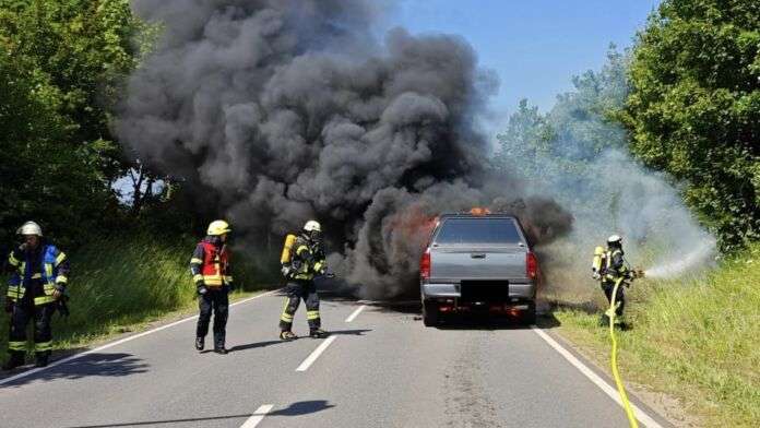 Ein Fahrzeugbrand auf der Landstraße zwischen Rüdesheim und Hargesheim erforderte am Samstagvormittag (3. Juni 2023) den Einsatz der Feuerwehr. Gegen 11 Uhr war in Höhe des neuen Rüdesheimer Gewerbegebietes ein Dodge-Pickup aufgrund eines technischen Defekts in Brand geraten.