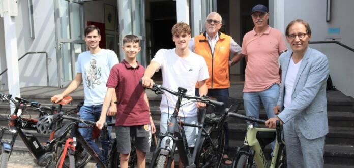 Foto: Schulleiter Stefan Hammer (rechts) freut sich schon auf die Exkursion und den interessanten Biologieunterricht im Stadtwald. Viel Spaß wünschen Stadtradeln-Organisator Thomas Fischer (2.v.r.) und Orga-Mitglied Tobias Weber (links) dem Tour-Guide Andreas Geers (3.v.r.) und den Schülern Philipp Celn (2.v.l.) und Milo Gött (3.v.l.). Foto: Hansjörg Rehbein