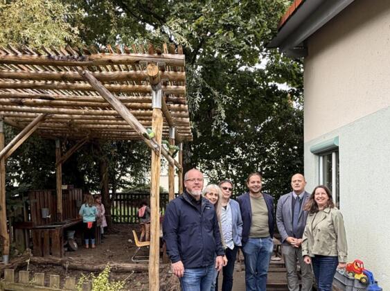 „Früher war dieser Platz an heißen Tagen nicht nutzbar“, sagte Kita-Leiterin Gaby Janzer-Wegeler. Jetzt sieht es dank einer Förderung des Landkreises Mainz-Bingen ganz anders aus. Eine neue Holzpergola über Sandkiste und Küchenzeile hält die stärksten Sonnenstrahlen ab und kühlt die Luft in dieser Ecke des Kita-Außenbereichs deutlich runter:
