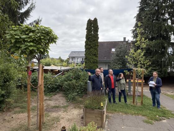 Der Erste Beigeordnete des Landkreises war in Mainz-Bingen unterwegs und besichtigte gemeinsam mit Hilmar Holland und Nadja Kaufmann vom Umwelt- und Energieberatungszentrum (UEBZ) des Kreises einige Projekte zur Klimaanpassung.