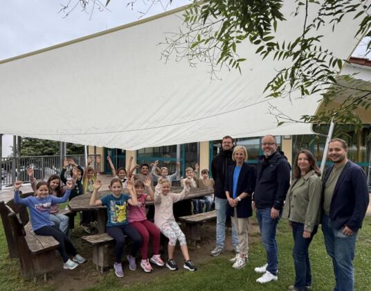Überdacht wird damit ein großer Holztisch mit Bänken drum herum: „Das wird hier sehr rege genutzt“, sagte die Schulleiterin. Vor allem die Ganztagskinder würden sich freuen, dass sie ihre Mittagspause draußen und im Schatten verbringen können. Gefördert wurde dieses Projekt mit rund 4400 Euro.