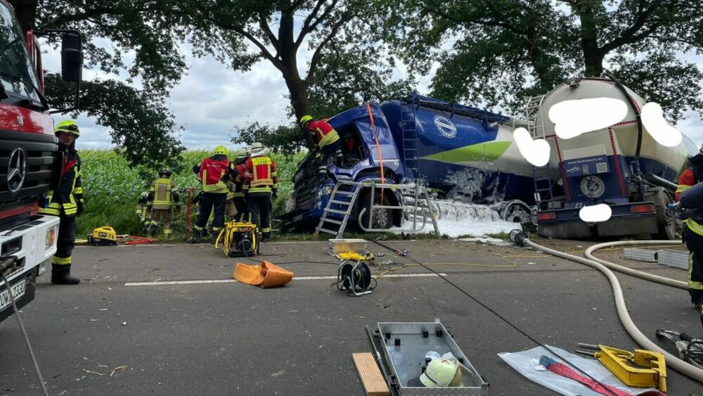 Noch während die Feuerwehr Sottrum am Dienstag (23. Juli 2024) auf der Rastanlage Grundbergsee bei einem Gasaustritt im Einsatz war, kam um kurz nach 9:30 Uhr die Meldung über einen schweren LKW-Unfall auf der B75 zwischen Hassendorf und Sottrum. Von der Einsatzstelle Grundbergsee startete umgehend der Rüstwagen und die Einsatzleitstelle für Feuerwehr und Rettungsdienst alarmierte die Feuerwehren aus Hassendorf und Rotenburg, sowie 2 Rettungswagen, ein Notarzt und einen Rettungshubschrauber zu dem Unfallort.