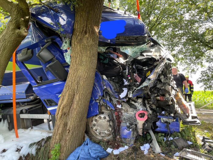Vor Ort zeigte sich, dass der LKW war frontal gegen einen Baum gekracht war. Der Fahrer konnte zwar verletzt, aber selbstständig sein Fahrerhaus verlassen. Sein Beifahrer hingegen war schwer eingeklemmt. Da der LKW mit rechter A-Säule gegen den Baum prallte, gestaltete sich das Schaffen eines Zuganges als sehr schwierig da. Mit mehreren Spanngurten wurde die Fahrerkabine gesichert.