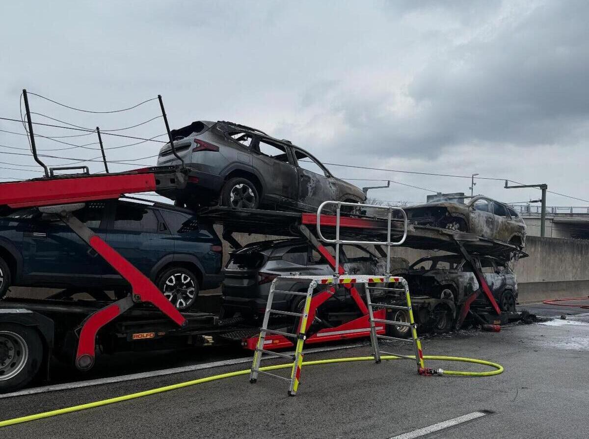 Der Vorfall ereignete sich gegen 13:30 Uhr auf der A3 zwischen Kelsterbach (Groß-Gerau) und dem Mönchhof-Dreieck. Auf einem Autotransporter entzündeten sich mehrere geladene Neuwagen der Marke Dacia aus bislang ungeklärter Ursache. Vier von insgesamt sechs transportierten Fahrzeugen brannten vollständig aus. Der Fahrer des Sattelzugs konnte sein Fahrzeug noch auf dem Standstreifen abstellen und sich rechtzeitig in Sicherheit bringen. Glücklicherweise wurde niemand verletzt, wie die Polizei mitteilte.