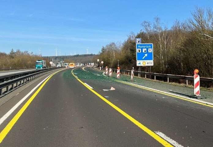 In der Baustelle kurz vor der Einfahrt zur Tank- und Rastanlage Hunsrück-Ost ereignete sich der Vorfall, als ein 40-jähriger Fahrer eines Sattelzuges aufgrund einer Reifenpanne auf dem Seitenstreifen stoppte. Ein nachfolgender 60-jähriger Fahrer eines weiteren Sattelzuges erkannte die Situation zu spät und kollidierte mit dem Zug des 40-Jährigen entlang der gesamten linken Seite. Als Folge dieses Zusammenstoßes fielen die auf dem Sattelzug des 60-Jährigen geladenen Glasflaschen auf die Fahrbahn und verteilten sich über eine Strecke von etwa 150 Metern. Beide LKW-Fahrer blieben glücklicherweise unverletzt, jedoch entstanden erhebliche Sachschäden an den Fahrzeugen, deren genaue Höhe noch nicht abschließend festgestellt werden konnte. Die Polizei schätzt die Schäden jedoch auf mehrere tausend Euro.