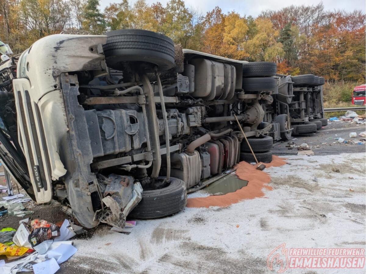 Lkw kommt von der Fahrbahn ab und kippt um