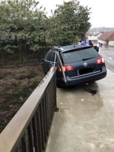 Durch den Zusammenstoß kam dessen Fahrzeug nach links von der Fahrbahn ab, durchbrach teilweise ein dortiges Brückengeländer und kam dort halb in der Luft hängend zum Stillstand. Der Mann erlitt durch den Unfall leichte Verletzungen, konnte sein Fahrzeug aber selbständig über die Beifahrertür verlassen. Der Unfallverursacher blieb unverletzt. Es entstand ein Gesamtsachschaden von ca. 80.000 Euro. Der VW Passat wurde durch Kräfte der Feuerwehr zunächst mittels mehrerer Seilwinden gegen Absturz gesichert bis er letztendlich durch ein Abschleppunternehmen geborgen werden konnte.