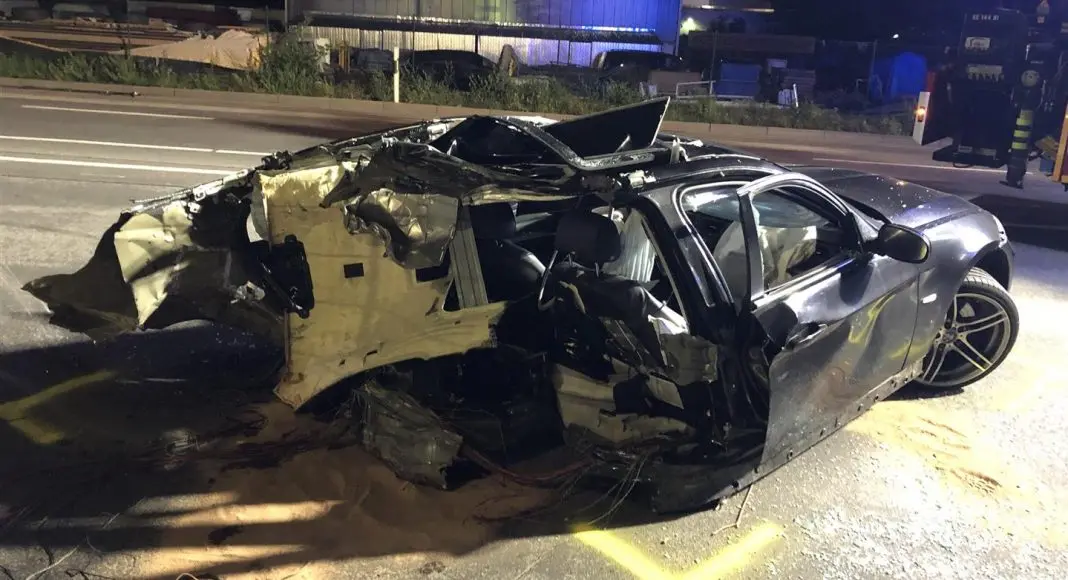 Der BMW wird durch den Zusammenprall um mehr als 90 Grad nach links gedreht, rutscht quer über die Fahrbahn und kollidiert mit dem Mast der Ampelanlage auf der gegenüberliegenden Kreuzung. Durch die enorme Wucht wird der BMW in zwei Teile gerissen. Das Fahrzeugheck, als auch die Fahrzeugfront werden in den Gegenverkehr geschleudert, wo sich glücklicherweise kein anderer Verkehrsteilnehmer befand.