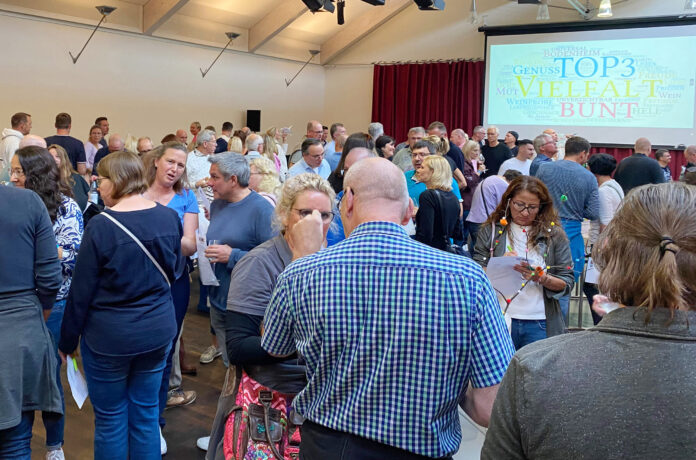 Die Spannung der zahlreichen Besucherinnen und Besucher war sichtlich zu spüren als die frisch gekürte rheinhessische Weinprinzessin Katja Klemmer aus Westhofen im Innenhof des Bürgerhaus Dolles gemeinsam mit dem Leiter des Arbeitskreises Top3, Michael Bonewitz, die Siegerweine der öffentlichen Weinprobe Bodenheim Top3 verlas.