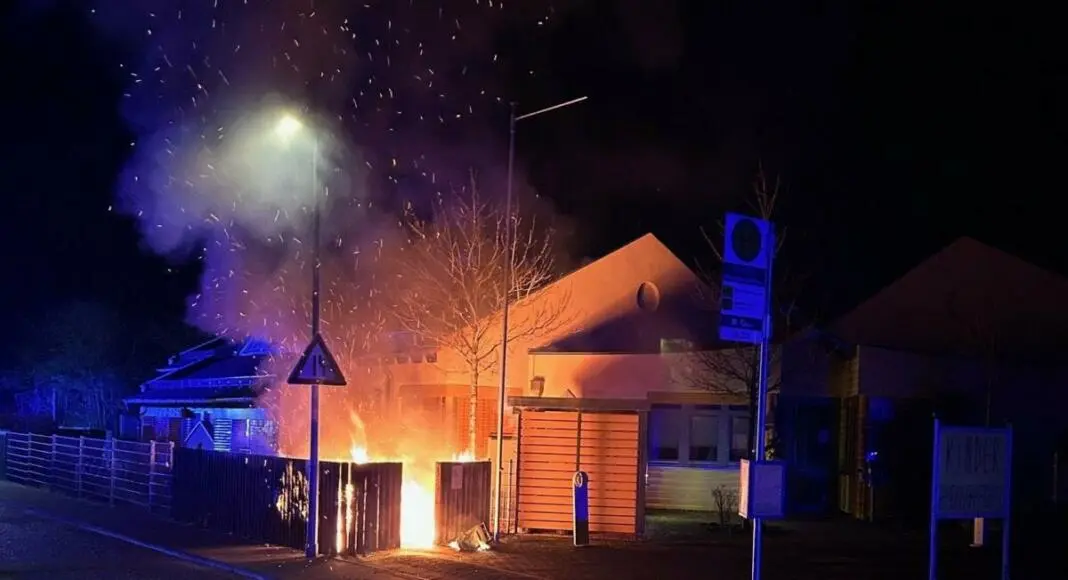 Noch während die Polizei den Vorfall in der Schifferstraße aufnahm, erreichte um 23:53 Uhr ein zweiter Notruf die Einsatzkräfte. Diesmal brannte es am Kindergemeinschaftshaus Nord in der Sporkenheimer Straße. Dort hatten Mülltonnen und hölzerne Begrenzungspfähle Feuer gefangen. Die Freiwillige Feuerwehr Ingelheim konnte die Flammen rechtzeitig löschen, bevor sie auf das Gebäude übergriffen. Dennoch entstand Sachschaden im mittleren vierstelligen Bereich.