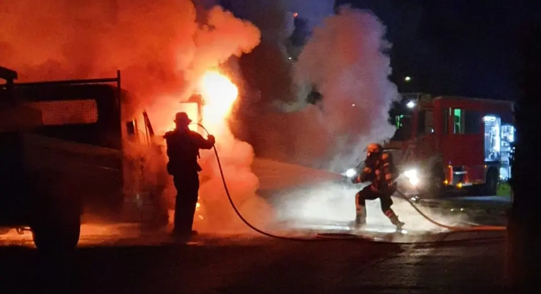 Es sollen auch mehrere Explosionen wahrgenommen worden sein, das teilten die Anrufer mit. Als die Feuerwehr vor Ort eintraf, konnten zwei brennende Fahrzeuge festgestellt werden. Sofort wurde durch die Feuerwehr ein Löschangriff unter Atemschutz eingeleitet um ein weiteres Ausbreiten der Flammen zu verhindern. Mithilfe von 2 C-Rohren konnten die Flammen schnell niedergeschlagen werden. Um in die Fahrzeugkabinen zu gelangen mussten die Türen mithilfe des Hydraulischen Rettungswerkzeuges aufgespreitzt werden. Im Anschluss wurden die Fahrzeuge mit einer Schaumdecke bedeckt, um alle Glutnester abzulöschen und ein erneutes Aufflammen zu verhindern. Da die Fahrzeuge neben den Bahngleisen abgestellt waren, kam die kurzzeitige Sperrung der Bahnlinie in Betracht, was aber nicht erforderlich wurde.