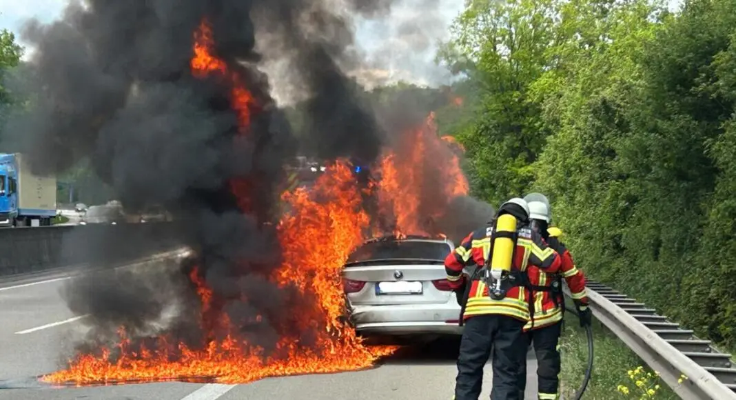 Vollsperrung A61: Am Donnerstagmittag gegen 13:30 Uhr ging auf der A61 in Fahrtrichtung Koblenz plötzlich nichts mehr. Auf Höhe von Waldalgesheim fing ein weißer BMW 5er Feuer. Der 32-jährige Fahrer bemerkte rechtzeitig die Gefahr, steuerte das Auto auf den Seitenstreifen und konnte sich unverletzt retten. Kurz darauf stand das Fahrzeug in Vollbrand.