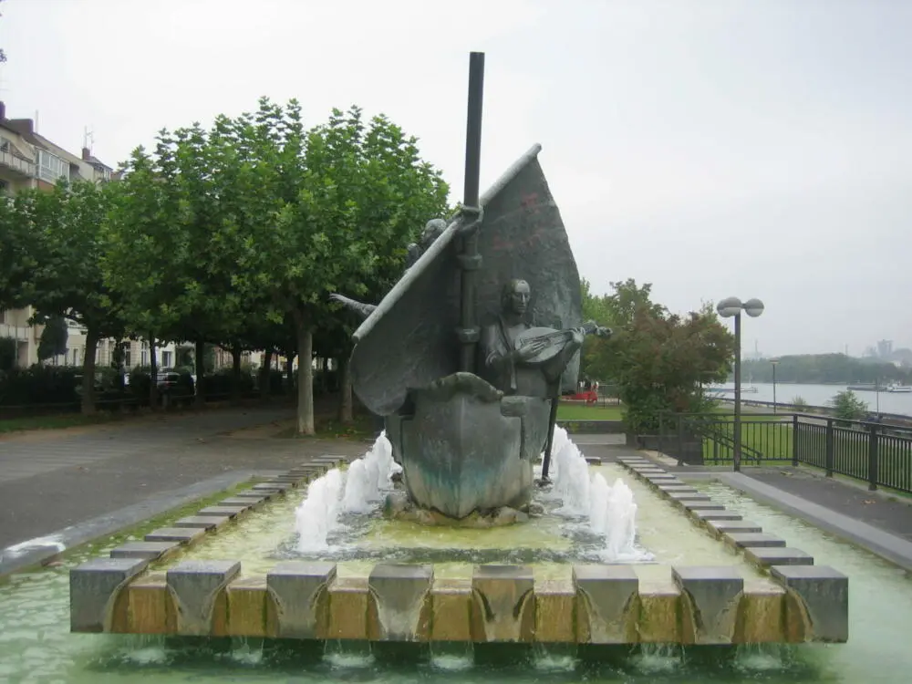 Die Frauenlob-Barke stellt den Mittelpunkt der  zwischen 1977 und 1980 umgestalteten Rheinuferpromenade zwischen Feldbergplatz und Kaisertor dar