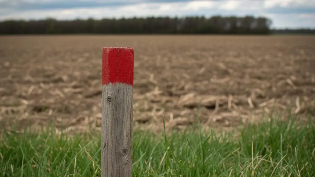 Rote Pfähle: Markieren meist Vermessungspunkte oder Grundstücksgrenzen. Sie signalisieren dem Landwirt: „Bis hierher und nicht weiter“, um Grenzstreitigkeiten oder das versehentliche Bearbeiten von Nachbarflächen zu verhindern.
