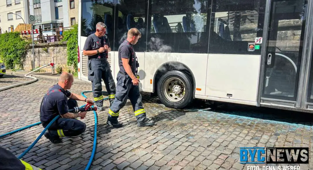 Der Fahrer des Omnibusses stellte seinen Bus gegen 16:25 Uhr in einer Parkbucht am Kaiser-Wilhelm-Ring in der Nähe des Hauptbahnhof Mainz ab. Kurze Zeit später wurde er von Passanten darauf aufmerksam gemacht, dass sein Gefährt an der Hinterachse stark qualmen würde, es rieche zudem stark verbrannt nach Gummi. Die Passanten alarmierten die Feuerwehr. Umgehend begab sich der Busfahrer mit seinem an Bord befindlichen Pulverlöscher auf Erkundung. An der Hinterachse angekommen, stellte er fest, dass es hinter der Zwillingsbereifung seines Zweiachsers zu einem Feuer gekommen war. Er erstickte die Flammen mit dem Pulverlöscher und verhinderte somit Schlimmeres.