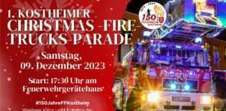 Parade mit weihnachtlichen Feuerwehrfahrzeugen durch Kostheim