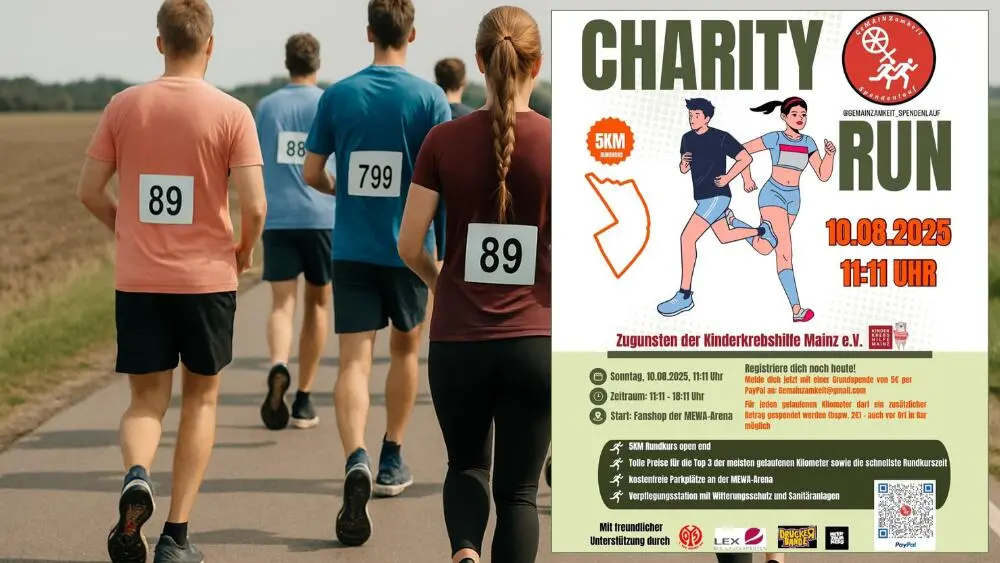 Charity Run Mainz: Sport treiben, Gutes tun und Gemeinschaft erleben – all das vereint der große Charity-Spendenlauf „GeMAINZamkeit“, der am Sonntag, 10. August 2025, auf dem Gelände rund um die MEWA-Arena in Mainz stattfindet. Auf einem 5-Kilometer-Rundkurs können Laufbegeisterte jeden Alters von 11:11 Uhr bis 18:11 Uhr so viele Runden laufen, wie sie möchten – und dabei Spenden für die Kinderkrebshilfe Mainz e.V. sammeln.
