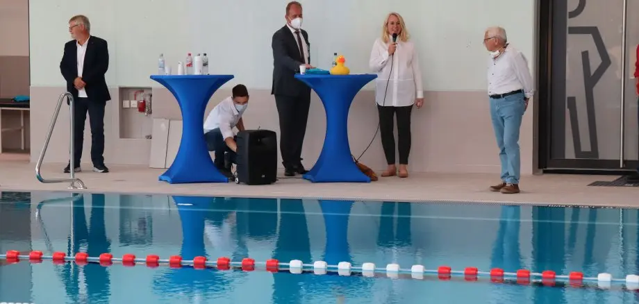 Die Gäste des neuen Hallenbades, das nun am Montag, 20. September, um 13 Uhr für die Öffentlichkeit geöffnet wird, können sich auf ein großes 25-Meter-Becken mit sechs Bahnen und Sprunganlage freuen. Zudem gibt es ein Lehrschwimmbecken mit 100 Quadratmetern Wasserfläche und ein separates Kleinkinderbecken.