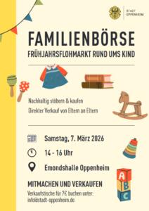 FamilienBörse in Oppenheim – Mit der zweiten Auflage der „FamilienBörse – Frühjahrsflohmarkt rund ums Kind“ am 7. März 2026 in der Emondshalle setzt die Stadt Oppenheim die erfolgreiche Veranstaltungsreihe nach der gut besuchten Premiere Ende des vergangenen Jahres fort. Aufgrund der positiven Resonanz sind für das Jahr 2026 insgesamt zwei FamilienFlohmärkte geplant.