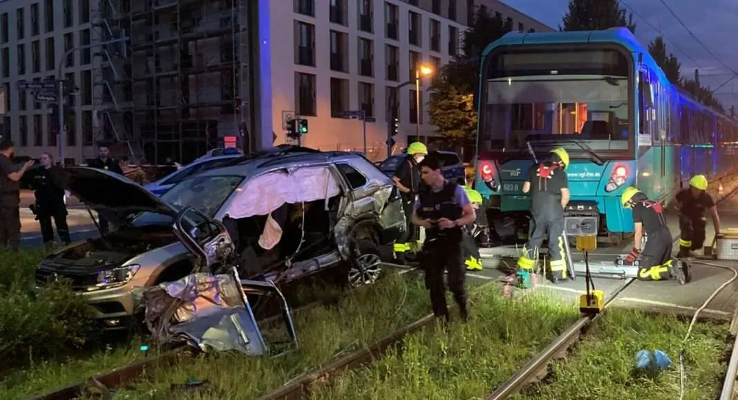 Wie die Feuerwehr Frankfurt mitteilt, wurde der Wagen von der stadteinwärts fahrenden U-Bahn erfasst und gegen einen Oberleitungsmast geschoben. Dabei entgleiste auch das erste Drehgestell der Bahn.
