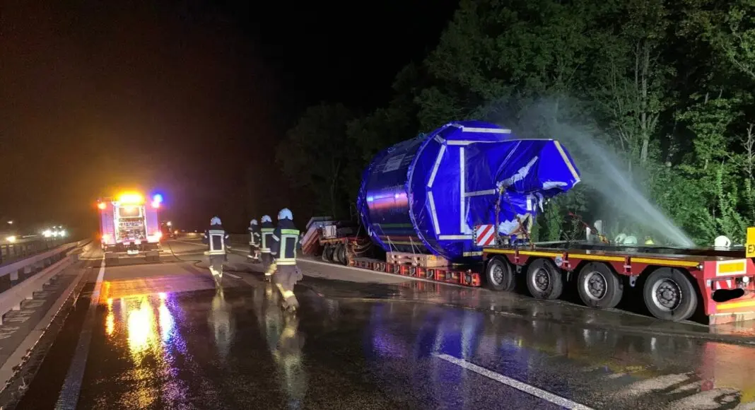 Bei einem auf der Autobahn A61 in Fahrtrichtung Koblenz fahrenden Schwertransport mit einem Gesamtgewicht von 107t kam es am 07. September 2021 gegen 22:35 Uhr zu einem Reifenschaden am Auflieger. Durch den 52jährigen Fahrer konnte der Sattelzug auf dem Standstreifen kurz nach dem Parkplatz Wiesbach zum Stehen gebracht werden.
