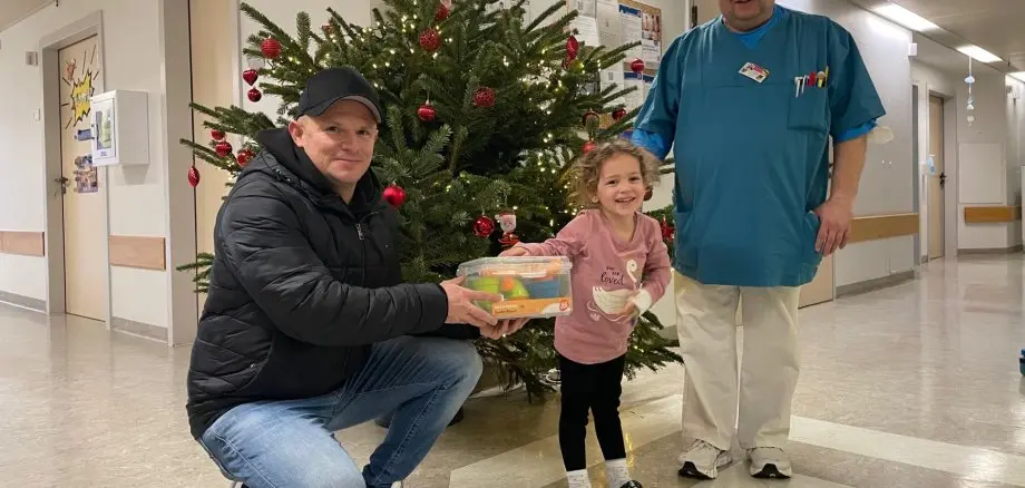 Die Geschenke überreichten die Feuerwehrkameraden stellvertretend an die kleine Mariam. Im Beisein von Gesundheits- und Kinderkrankenpfleger Christian fand die Übergabe vor dem festlich geschmückten Weihnachtsbaum auf der Station statt. Von dort aus wurden die Präsente an die übrigen Kinder weitergeleitet.