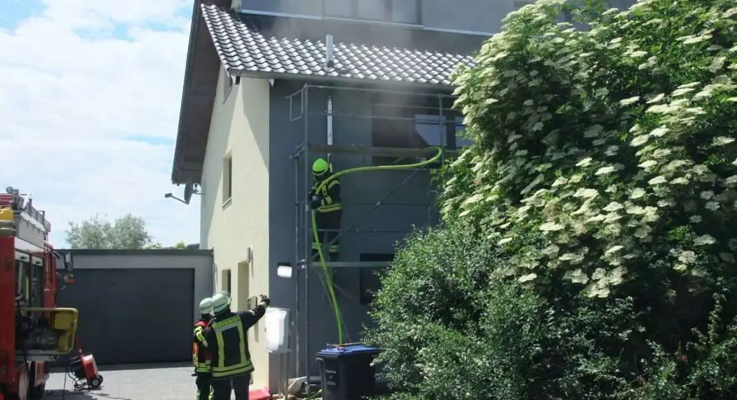Bei Eintreffen der Einsatzkräfte drang bereits dichter Rauch aus dem gekipptem Fenster. Nachbarn teilten mit, dass sich keine Menschen im Gebäude befanden, sodass umgehend mit der Brandbekämpfung begonnen werden konnte. Über ein Gerüst am Gebäude verschaffte sich der Angriffstrupp unter Atemschutz Zugang zum Obergeschoss und öffnete gewaltsam ein Fenster, um erste Löschmaßnahmen durchzuführen. Ein weiterer Atemschutztrupp nutzte ebenfalls das Gerüst als Aufstieg, stieg durch ein weiteres Fenster ein und unterstützte nach Öffnen der Haustür die Brandbekämpfung im Inneren. Über die Eingangstür wurden umfangreiche Belüftungsmaßnahmen durchgeführt.