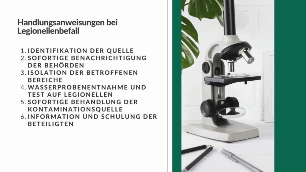 Wird ein Legionellenbefall festgestellt, sind sofortige Maßnahmen erforderlich. Dazu gehört die Benachrichtigung aller Bewohner und Nutzer des Hauses sowie des örtlichen Gesundheitsamts. Betroffene Wassersystem sollte vorübergehend stillgelegt werden, um eine weitere Ausbreitung zu verhindern. Zudem ist in einem solchen Fall die fachkundige Untersuchung und Sanierung des gesamten Wassersystems unerlässlich, gefolgt von regelmäßigen Wasseruntersuchungen, um sicherzustellen, dass das System frei von Legionellen bleibt. Abschließend ist eine genaue Dokumentation und Meldung des Befalls und der ergriffenen Maßnahmen an das Gesundheitsamt erforderlich.