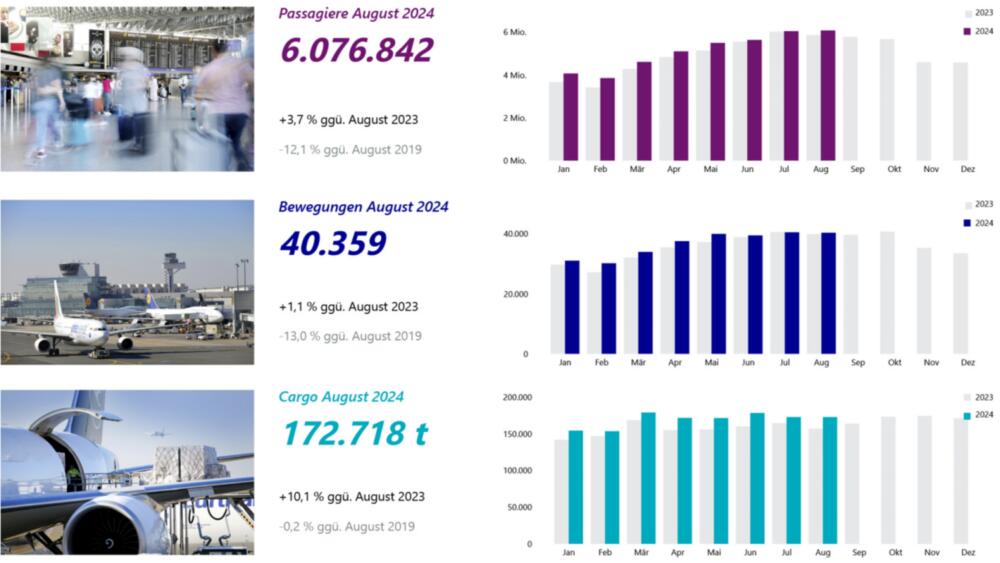 Neben dem Passagieraufkommen konnte auch das Cargo-Volumen mit einem Plus von 10,1 Prozent auf 172.718 Tonnen im Vergleich zum August 2023 zulegen. Die Anzahl der Flugbewegungen stieg um 1,1 Prozent auf 40.359 Starts und Landungen, während die Summe der Höchststartgewichte um 2,6 Prozent auf rund 2,5 Millionen Tonnen wuchs.