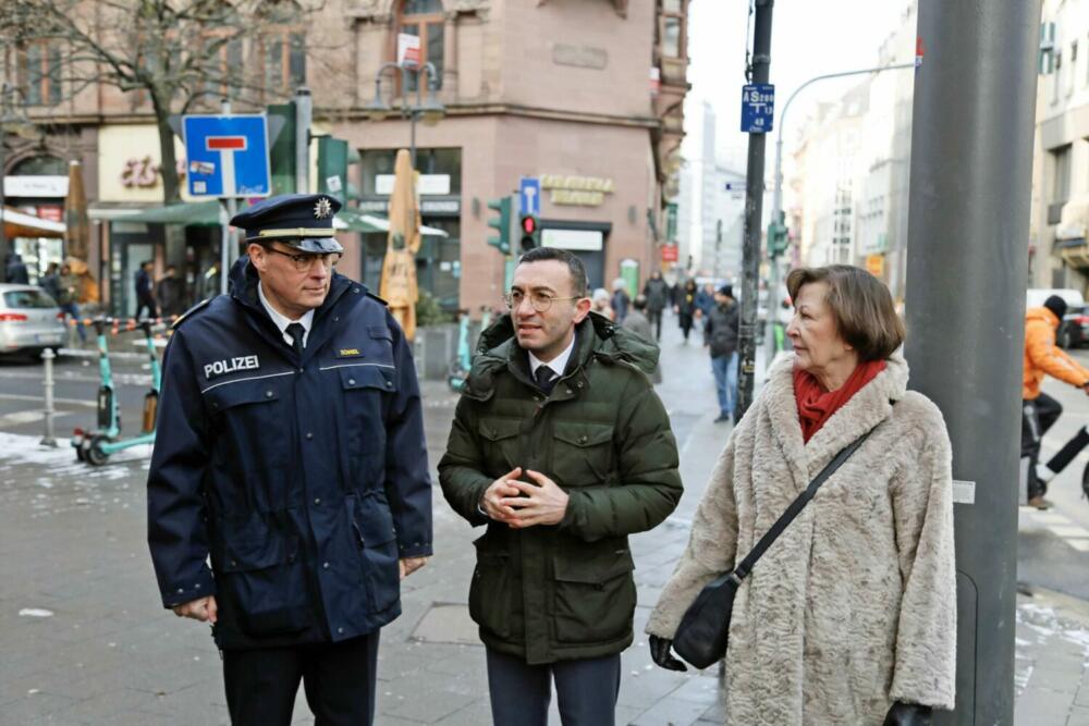 Bei einer gemeinsamen Pressekonferenz der Stadt Frankfurt am Main und der Polizei Frankfurt stellten Oberbürgermeister Mike Josef, Ordnungsdezernentin Annette Rinn und der Leiter der Abteilung Einsatz bei der Polizei Frankfurt, Thomas Schmidl, in den Räumlichkeiten des Polizeipräsidiums die neue Videoschutzanlage der Stadt für mehr Sicherheit im Bahnhofsviertel vor.