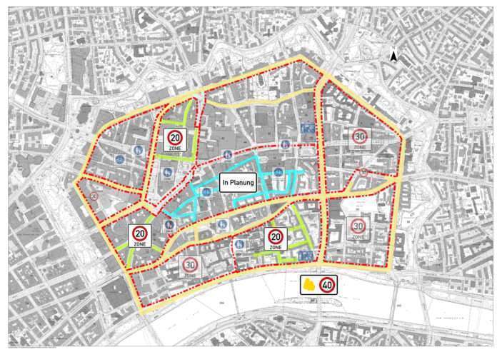Alle weiteren verkehrsrechtlichen Regelungen gelten analog der Tempo-30-Zone, beispielsweise gilt hinsichtlich der Vorfahrt grundsätzlich „Rechts vor Links“. Die Hauptverkehrsstraßen zur Erschließung der einzelnen Blöcke behalten ihre aufgrund des Luftreinhalteplans angeordnete Geschwindigkeitsbegrenzung auf 40 km/h.