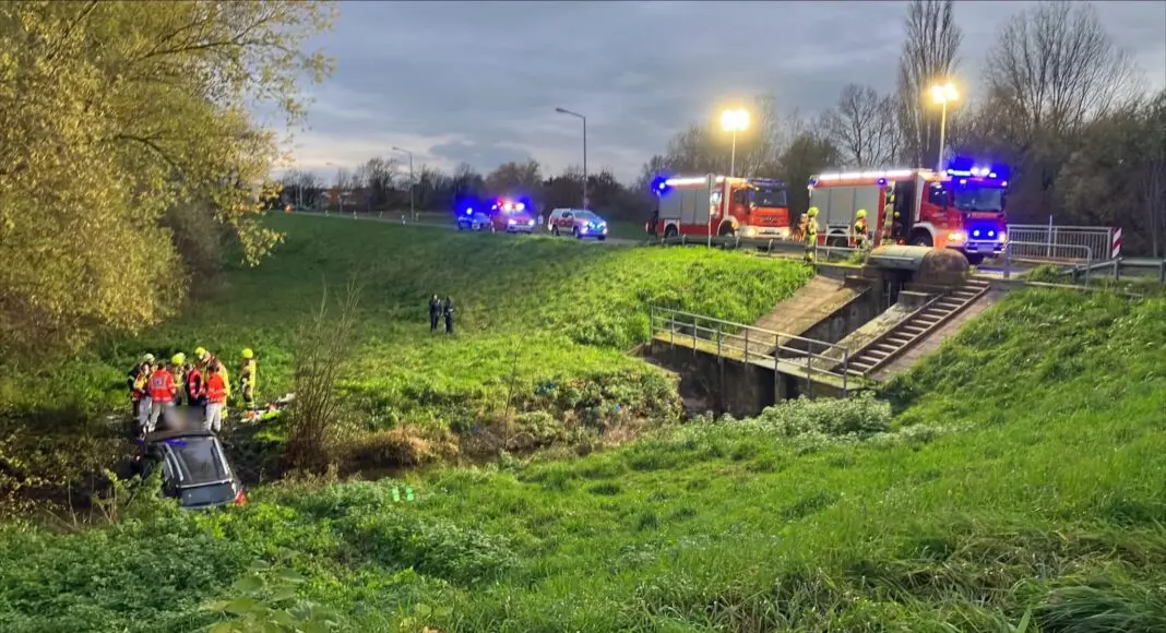 Das Auto musste von der Feuerwehr aus dem Entwässerungskanal geborgen werden, weil die Gefahr bestand, dass auslaufende Betriebsstoffe über den Entwässerungsgraben in den Rhein geraten.