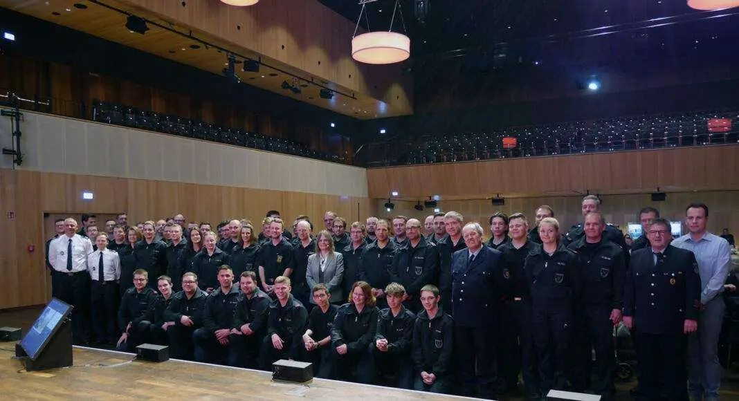 Nach der Pause wartete der offizielle Teil des Abends. Bei den Ver- und Entpflichtungen, Beförderungen, Bestellungen und Ehrungen wurden die einzelnen Feuerwehrleute auf die Bühne gebeten. Herausragend war die Ehrung von Löschmeister Bernd Appel, der für 45 Jahre aktiven Dienst stehende Ovationen erhielt. Brandinspektor Oliver Bender und Hauptbrandmeister Michael Hammer wurden für 25 Jahre aktiven Dienst geehrt. Jendrik Kloos, Jonas Krikken, Christoph Kußmann, Pascal Lehr, Carina Rösch, Thomas Steinbach, Dominik Schapfel und Jörn Schüler erhielten eine Urkunde für 15 Jahre aktiven Dienst. Eine besondere Ehrung erfuhr Manfred Weitmann, der in über 1.000 Lehrgangsstunden unzählige Lehrgänge als Kreisausbilder für den Landkreis Mainz-Bingen durchgeführt hat und hierfür vom Kreisfeuerwehrverband mit dem Ehrenzeichen in Silber ausgezeichnet wurde.