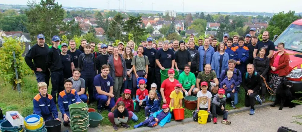 Bei bestem Wetter und bei angenehmen 20 Grad versammelten sich vorgestern, am 3. Oktober, 60 fleißige Helfer von Feuerwehr und Winzern, um mit Eimer und Schere die Trauben für den besonderen „112er Löschwoi“ zu lesen.