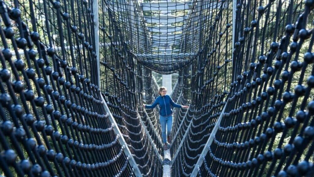 Interaktive Hör-, Fühl- und Riech-Stationen entlang des schwingenden Baumwipfelpfades vermitteln bei einem Spaziergang Wissenswertes über den Wald. Auf der schwingenden Hängebrückenkonstruktion braucht es dafür eine kleine Portion Mut.