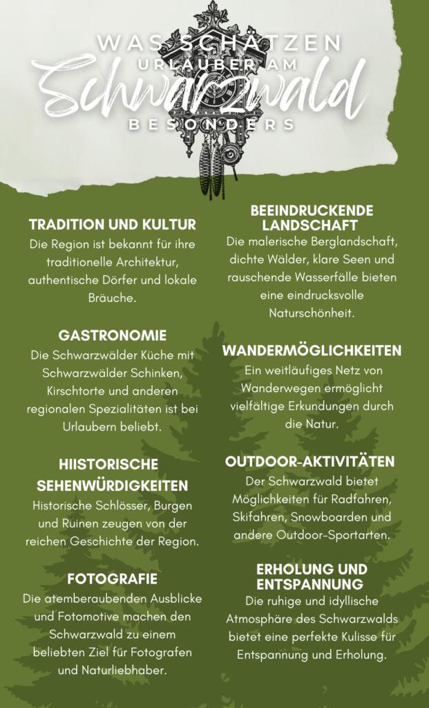 Der Schwarzwald ist die ideale Urlaubsregion für alle, die sich nach Entspannung und Erholung sehnen. Ob entspannte Stunden in einem der bekannten Thermalbäder, Wanderungen durch die Wälder oder kulinarischer Genuss- im Schwarzwald ist für jeden etwas dabei. Wir wünschen gute Erholung!