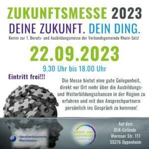 Am Freitag (22. September 2023) findet in der Zeit von 9:30 Uhr bis 18:00 Uhr die Berufs- und Ausbildungsmesse in Oppenheim statt. Der Veranstaltungsort ist das Dienstleistungszentrum Ländlicher Raum Rheinhessen-Nahe-Hunsrück (DLR-Gelände) in der Wormser Straße 111 in Oppenheim. Veranstaltet wird die Messe vom Kinder- und Jugendbüro der Verbandsgemeinde Rhein-Selz in Kooperation mit der Handwerkskammer Rheinhessen.