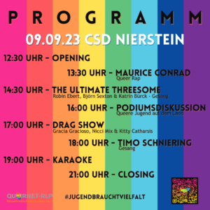 - 16:00 Uhr: Podiumsdiskussion zum Thema „Queere Jugend auf dem Land“ mit Martin Groth, Maurice Conrad, Enrique Doleschy, Janosch Littig und der Queerbeauftragten der Polizei Rheinland-Pfalz, Diana Gläßer