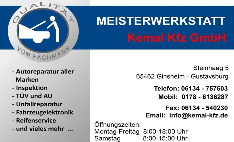 Der Kfz-Meisterbetrieb Kemal Kfz GmbH ist bereits seit 1997 in Gustavsburg und bietet zahlreiche Serviceleistungen rund um das Auto an. Dazu zählen unter anderem die Reparatur von Personenkraftwagen und Nutzkraftwagen aller Hersteller, sowie die Inspektion nach den entsprechenden Herstellervorgaben. Auch die Tüv- und Abgasuntersuchungen werden dort von einem TÜV Unternehmen durchgeführt. Zudem werden professionelle Gutachten ausgestellt. Die Fahrzeug- und Elektrikdiagnose, sowie Arbeiten an Karosserie und Lack sind mit Terminvereinbarungen möglich. Besonders im Herbst steht natürlich bei vielen der Reifenwechsel an. Dieser wird bei Kemal Kfz schnell und unkompliziert erledigt. Gleiches gilt auch für den Klimaservice, wenn es wieder auf die wärmere Jahreszeit zugeht. Alles in allem wird in dem Familienbetrieb ein Rundum-Paket für die Kundinnen und Kunden angeboten.