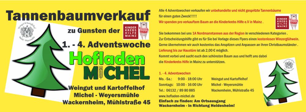 Bereits im achten Jahr in Folge werden auch 2024 wieder im Ingelheimer Stadtteil Wackernheim beim Hofladen Michel echte Nordmanntannen für den guten Zweck verkauft. Ab dem 25. November 2024 kann man sich beim Hofladen Michel auf eine Auswahl unbehandelter und nicht gespritzter Tannenbäume freuen.